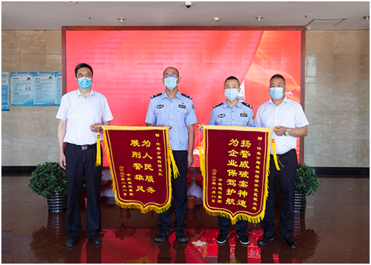 培训中心主任孔德明代表华体会官方版网站登录入口向怀柔分局雁栖经济开发区派出所所长和怀柔分局刑侦支队支队长送上锦旗,代表公司感谢人民警察服务企业生产建设、守护一方平安付出的艰辛努力,感谢怀柔分局雁栖开发区派出所和怀柔分局刑侦支队急企业所急、想人民所想,在企业遇到困难时及时出警,有力保障了企业财产安全,维护了社会良好秩序,为企业发展创造了平安和谐的营商环境。